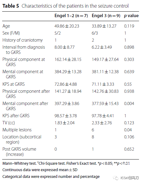 在统计分析中,有效的癫痫控制的级别(Engel I/II)与患者患有单个病变(p< 0.05)和深部位置(p<0.01)高度相关。新的神经功能障碍与生存质量测试部分的心智减退(decreased mental)(p<0.05)和体力下降(p <0.001)、KPS (p <0.001),深部位置(p<0.01),病灶体积增加(p<0.05)高度相关。在体力部分(p <0.01)、心智部分(p<0.01)、和KPS (p <0.05)方面的生存质量恶化与海绵状血管瘤体积增大高度相关。