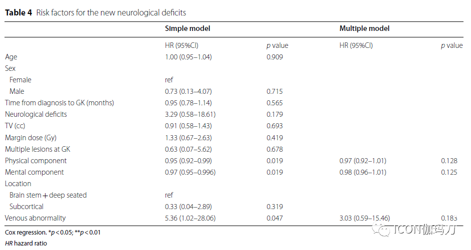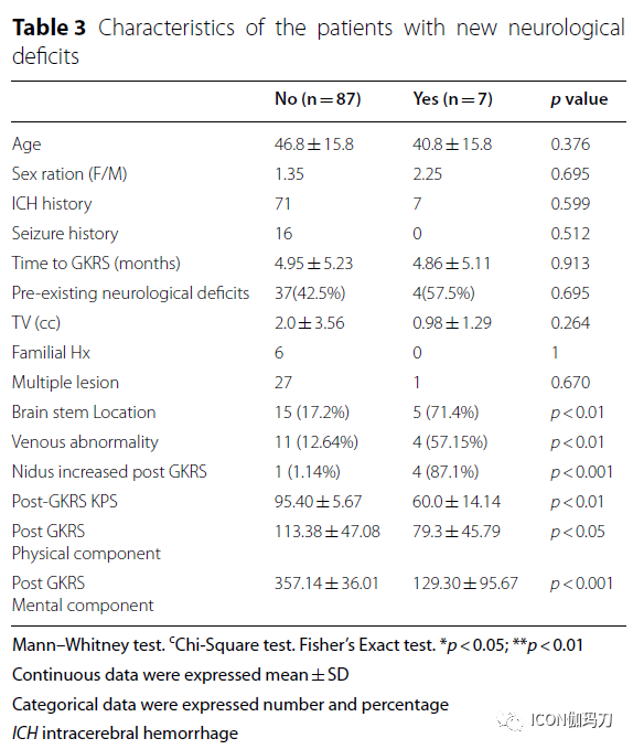 对GKRS治疗后海绵状血管瘤出血率降低的评估存有一些争论。这些争论包括评估再出血率的起效潜伏期较长(the longer latency to assess the rebleeding rate),选择和治疗偏倚(selection and treatment biases),接受手术患者的分配不均匀(uneven allocation of the patients to operation),出血事件的一时性聚集(the temporal clustering of hemorrhage events),发生新生CM(de novo CM development),CM的动态变化(dynamic changes)。在本研究中,在GKRS治疗后13个月和52个月的随访中只有2例出现出血。由于GKRS治疗前出血发生率低且难以确定出血发作,所分析的因素确实与再出血的发生有显著关系。
