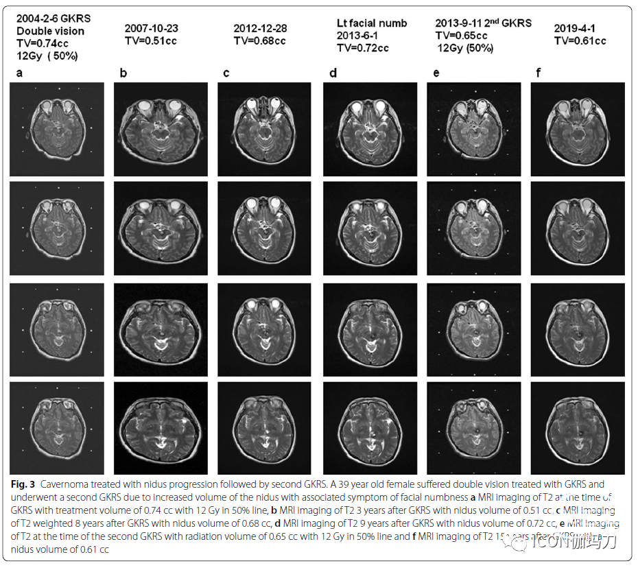 图3第二次GKRS治疗海绵状血管瘤后病灶进展。一名罹患复视的39岁女性接受GKRS治疗,并由于与面部麻木症状相关的病灶体积增加接受第二次GKRS治疗。a 12 Gy,50%,GKRS治疗时的T2磁共振成像上体积为0.74 cc ,bGKRS治疗3年后的T2 磁共振成像病灶上体积为0.51毫升,cGKRS治疗8年后T2加权磁共振成像上的病灶体积为0.68 cc, d GKRS 治疗9年后T2磁共振成像上的病灶体积为0.72 cc, e 12 Gy, 50%,第二次GKRS治疗时的T2磁共振成像的上照射的体积0.65 cc;f GFKRS治疗15年后T2 MRI成像上病灶体积为0.61 cc。