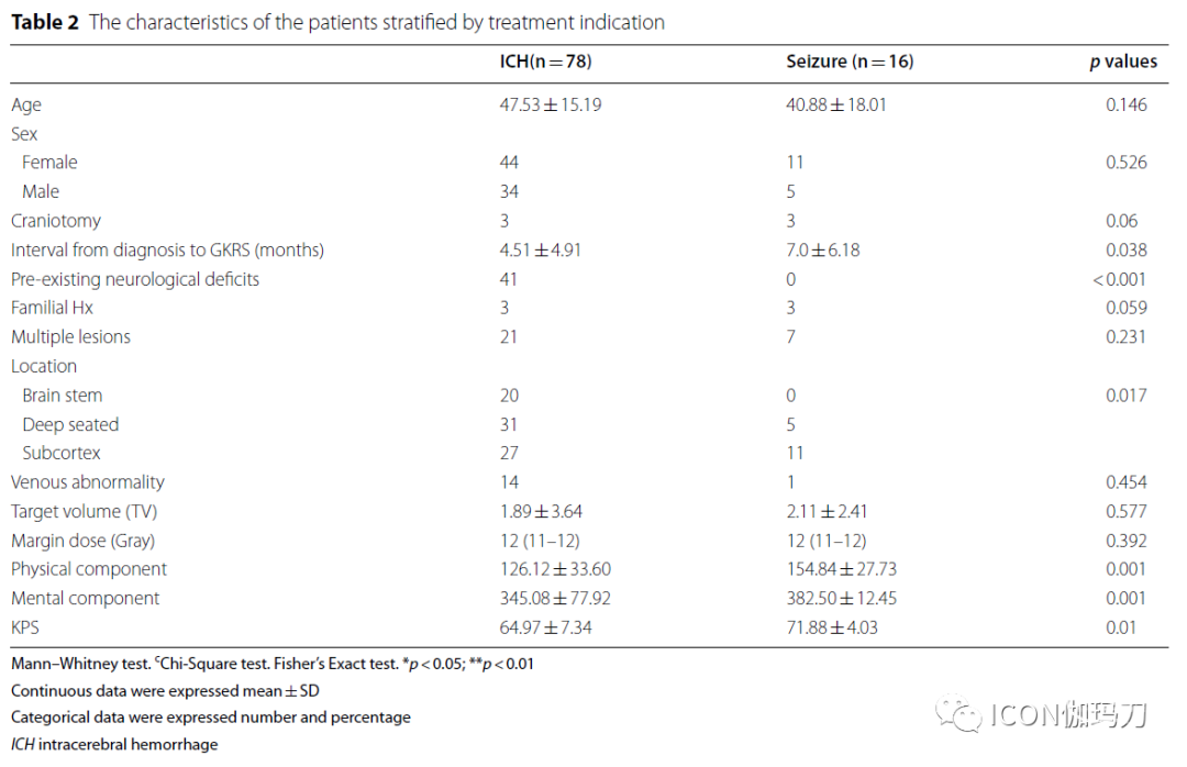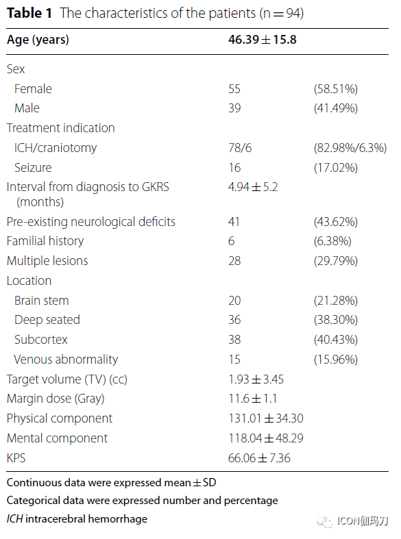 从2003到 2018年,经两名经验丰富的神经病学专家双盲评估,经GKRS治疗脑内海绵状血管瘤94例,经批准接受GKRS治疗。所有患者接受边缘剂量为11-12 (Gray) Gy的GKRS治疗,然后评估神经系统预后、放射影像学反应和生活质量。