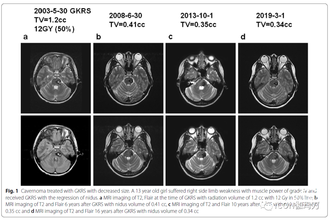 图1.经GKRS治疗的海绵状血管瘤体积缩小。1例13岁女孩右侧肢体无力,肌力IV级,接受GKRS治疗,病灶消退。A T2磁共振成像,GKRS时的FLAIR上12 Gy ,50%照射体积为1.2 cc ,bGKRS6年后T2和FLAIR磁共振成像上的病灶体积为0.41 cc, c GKRS治疗10年后T2和FLAIR磁共振成像的病灶体积为0.35 cc;d GKRS治疗16年后T2和FLAIR磁共振成像的病灶体积为0.34 cc。