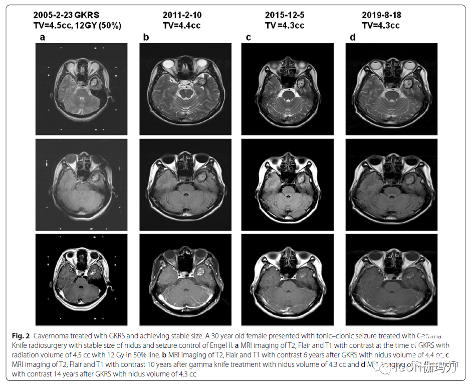 图2经GKRS治疗的海绵状血管瘤大小稳定。一位30岁女性,因强直性阵挛性癫痫发作,接受伽玛刀放射外科治疗,病灶大小稳定,Engel II级癫痫发作控制。GKRS时T2、Flair和T1 MRI,照射体积4.5 cc, 12Gy, 50%线。B GKRS治疗6年后T2,Flair和T1对比增强磁共振成像的病灶体积为4.4 cc, c伽玛刀治疗10年后T2,Flair和T1对比增强磁共振成像的病灶体积为4.3 cc;d GKRS治疗 14年后T2,Flair和T1对比增强磁共振成像上病灶体积4.3 cc。