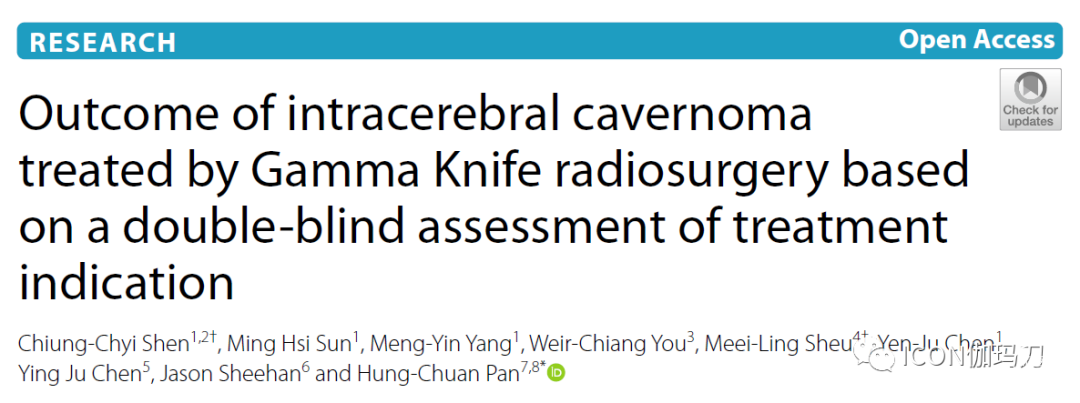《Radiation Oncology》杂志2021年8月28日刊载[16(1):164.]台中荣民总医院的 Chiung-Chyi Shen, Ming Hsi Sun, Meng-Yin Yang,等撰写的《双盲评估基于治疗指证的伽玛刀放射外科治疗脑内海绵状血管瘤的疗效。Outcome of intracerebral cavernoma treated by Gamma Knife radiosurgery based on a double-blind assessment of treatment indication》 (doi: 10.1186/s13014-021-01885-4. )。