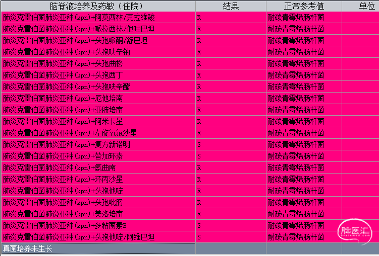 予以加用舒普深2g q6h联合抗感染,并发起特殊抗菌药物(多粘菌素B)临床使用申请。5月5日患者脑脊液培养及药敏回报提示:耐碳青霉烯肺炎克雷伯菌肺炎亚种(kpn),仅对头孢他啶/阿维巴坦、多粘菌素B、复方新诺明、替加环素敏感(图6)。