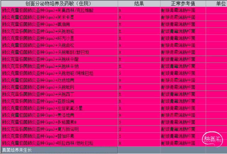 图4. 患者5月4日腰大池置管引流出流出脓性脑脊液。5月4日患者头部伤口分泌结果回报为耐碳青霉烯肺炎克雷伯菌,仅对头孢他啶/阿维巴坦、多粘菌素B、复方新诺明敏感,替加环素中介(图5)。