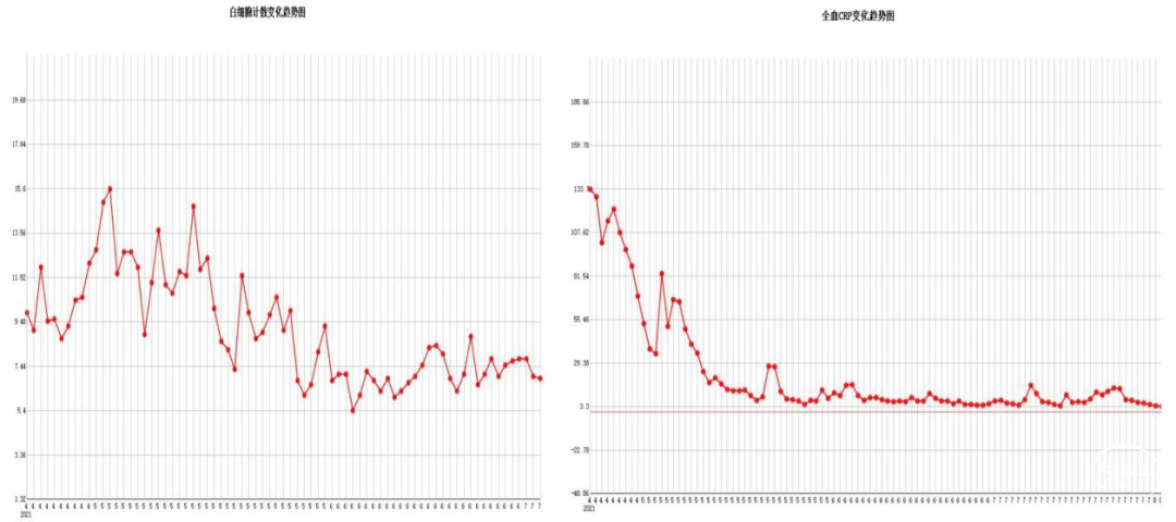 图9. 患者入院后白细胞及CRP的变化趋势。
