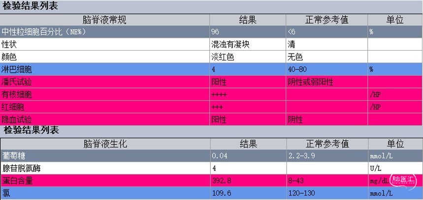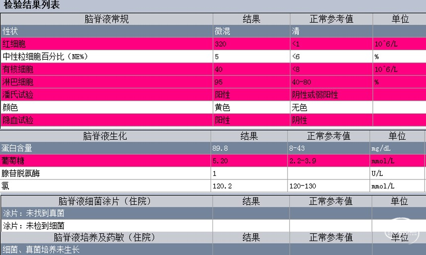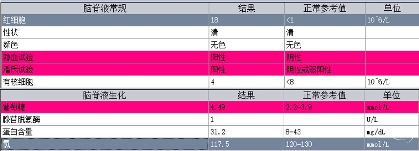 图3.患者5月3日腰椎穿刺脑脊液常规及生化结果。