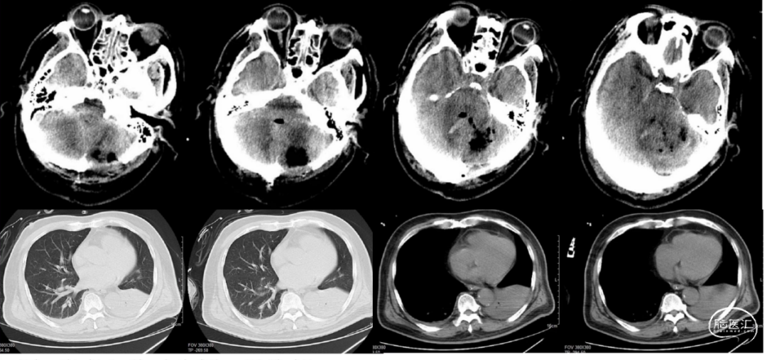患者2天前(4月6日)晚饭后出现头晕,口齿含糊,行走不便,至当地人民医院就医,急诊就诊期间出现喷射样呕吐数次,随后出现意识不清,急诊头颅CT提示:左侧小脑半球脑内血肿形成,出血破入脑室系统及蛛网膜下腔,急诊行“双侧脑室外引流+小脑血肿清除+去骨瓣减压术”,术后转ICU,机械通气,降颅压,抗感染等治疗,术后患者持续昏迷,患者家属为进一步治疗转来我院,急诊拟“小脑出血”收住我科。既往有高血压病史。入院查体:体温:37.2℃,昏迷,GCS 1+T+1,双侧瞳孔直径2mm,对光反射迟钝,头部两根脑室外引流管,双侧引流通畅,引流出血性液体,后枕部伤口稍有渗出,予换药,去骨瓣处张力中等。两肺呼吸音粗,可及痰鸣音,气管插管,机械通气,心率:94次/分,心律齐,血压:222/99mmHg,腹软,四肢肌力查体不配合,肌张力不高,双侧巴氏征阳性。辅助检查:2021-04-08我院头颅及胸部CT提示:颅脑术后改变,术区积气积液,脑室系统少许积血,两侧额颞部少许硬膜下积血积液(图1)。左下肺支气管塞伴左下肺实变考虑,两侧少量胸腔积液。
