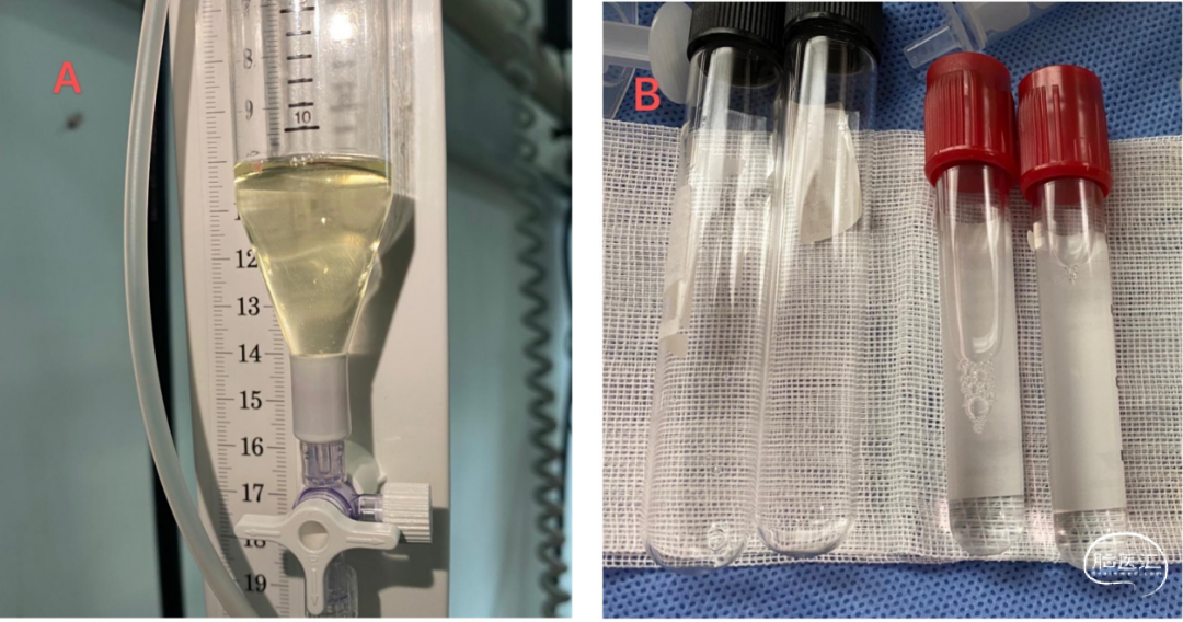 5月5日开始给予多粘菌素B 5万单位qd鞘内注射。5月5日患者腰大池不通,无脑脊液引出,急诊复查头颅CT提示梗阻性脑积水,予以拔除腰大池置管;于5月6日行右侧脑室外引流,引流出黄色浑浊脑脊液,同时患者出现体温较前上升,考虑颅内感染控制不理想,结合患者脑脊液培养及mNGS结果均为耐碳青霉烯肺炎克雷伯菌,依据药敏结果,予加用头孢他啶/阿维巴坦针2.5g q8h静滴抗感染治疗。多粘菌素B鞘内注射7天后停用,随后单药头孢他啶/阿维巴坦2.5g q8h静滴抗感染,积极抗感染1周后患者脑脊液性状好转,由浑浊逐渐转为清亮(图7A),脑脊液送检有核细胞下降、葡萄糖升高、细菌涂片培养为阴性。5月19日CT复查提示患者存在梗阻性脑积水,予以留置ommaya囊接外引流装置持续引流,每5天更换外引流装置1次。随后多次经过ommya囊及腰椎穿刺留取脑脊液,7月5日经ommaya囊及腰椎穿刺留取脑脊液(图7B)行常规生化检查,经ommaya囊留取的脑脊液常规、生化检验结果如下(图8A),经ommaya囊及腰椎穿刺留取脑脊液培养及宏基因组二代测序(mNGS)结果均为阴性(图8B)。