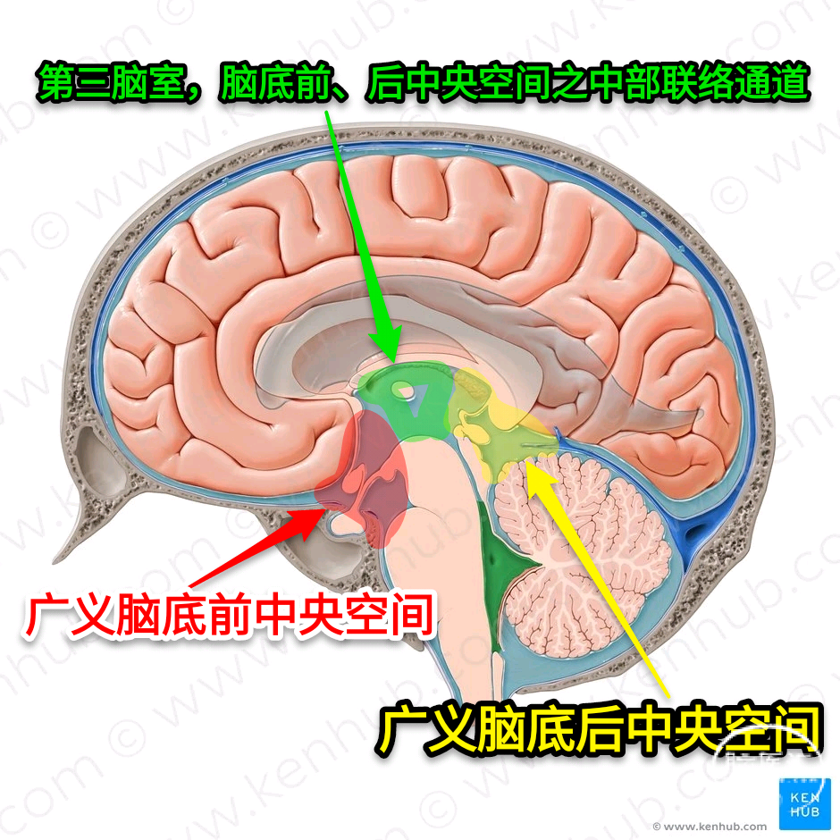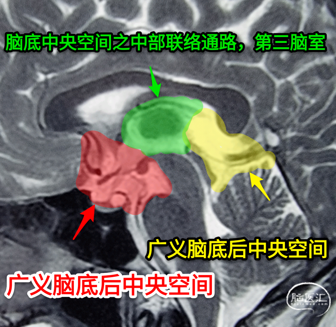 笼统来说,颅内脑底之中心区域,是由脑底各部(额、颞、枕)内侧“包绕”形成,中脑如柱居于其中。故中心区域除却“实在”之中脑,其所余之“空虚”部分,即为“脑底中央空间”。也因此,脑底中心区域之脑底中央空间又被其间“实在”的中脑大致分隔为两个相对独立的“脑底前中央空间”和“脑底后中央空间”。两者由位于中脑两侧的环池以及其顶端中线部之第三脑室(广义)相互沟连。然此等“空虚”之脑底中心区域,为何不俗之为“间隙”或“池”,而必另称“空间”?曰:盖因其乃由若干脑池群相聚而成,其体更大,“间隙”或“池”,已难表其阔,故概称“空间”以副其实也。若奉以具辞,俾释理愈有据焉。而前后空间之沟连者,不论是两侧的环池,还是中间之第三脑室,并不空阔,名之“空间”似有不妥。其实,做为联络脑底前、后中央空间的中间通道,中脑顶部罅隙状的三脑室,因其前部之膜状三脑室前下底部和其后部深静脉系统之膜性结构的存在,而分别与脑底前中央空间和脑底后中央空间完全间隔开来,在解剖上并未形成真正一体贯通有脑脊液交换的空间结构。是因,第三脑室与脑底前、后中央空间的解剖联系非常紧密,尽管其前后存在这两个膜状(性)之解剖隔断,但其过于“薄弱”,难成韧固之“壁”。所以,肿瘤病变难受其羁而常恣肆于间,是故,就将中脑顶端之第三脑室视做事实上的联络脑底前、后中央空间的中央通道。但有时,换个角度来看,亦可将三室前、后部视为广义的脑底前、后中央空间的一部分。