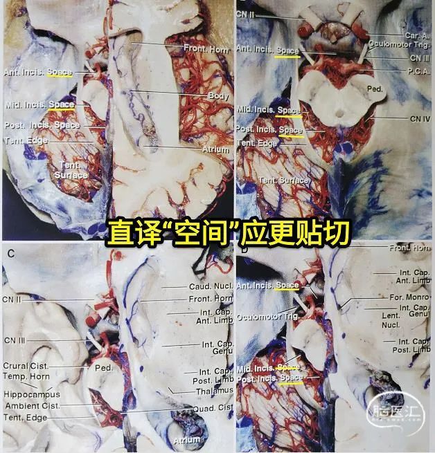 可归为解剖学上的概念。由Rhoton提出并加以论述(参见其中文版《颅脑解剖与手术入路》,第563页第五章,小脑幕切迹。中国科学技术出版社,2010年5月第一版。)。这个概念包括了前切迹间隙(anterior incisural space)、中切迹间隙(middleincisuralspace)和后切迹间隙(posterior incisural space)。其含意和分区已非常接近余所提出之脑底中央空间及细分之脑底前中央空间、脑底后中央空间和中脑两侧沟通前后空间之通道。在此,余有几点感受: