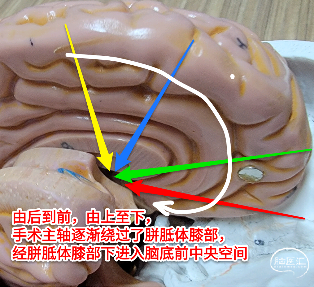 d.因前述,将正常呈罅隙状中脑顶部的第三脑室做为了广义脑底前、后中央空间的联络通路,如此,阐释手术的思路和观察角度也更加丰富了,对手术策略的选择亦有一定的指导意义。