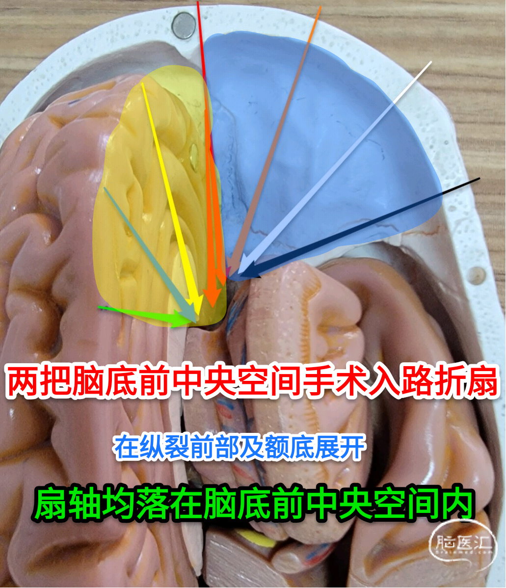 脑底前中央空间大部位于鞍上,即额底水平以上,可通过额极周边之侧裂、额底及前额纵裂等自然裂隙(通路)进至脑底前中央空间。由此形成了a,前额纵裂面由上至下;b,额极底面从外(侧裂)至内(纵裂);c,额部外侧(侧裂)三组轴向之手术入路集群,这些进入角度不同的手术入路视轴最终均聚焦于脑底前中央空间中。形象的说,如将所有进入脑底前中央空间手术入路之主轴线制作成图,即可得到具象化的两把同时打开互呈90°展现的“扇面”。前述a项即为竖立扇面,b、c两项则构成了水平扇面。当然,这两把折扇的“扇轴”(手术标的)必相会重合在脑底前中央空间里。另外,无分种族、年龄和性别,人类头颅外观正常的自然形态均是前后径大于左右径,这是勿需解剖测量来验证的常识。因此,从侧方(水平扇面)进入脑底前中央空间的手术路径必然短于由中线纵裂(竖立扇面)进入之手术路径,这是侧方入路固有的优势。但是,由于脑底前中央空间位置深在和“隘口”结构的遮蔽,侧方入路时会产生一些不可克服逾越的手术盲区或“翼点死角”,这些手术死角不可能通过手术技巧的提高和手术经验的积累而完全消除。例如,鞍内、术侧视神经与视束内侧、两侧之下丘脑核心区和三脑室穹顶部等,这些术中无法直视的翼点死角当然成为了侧方手术轴向的固有劣势。而由中线纵裂进入的入路虽然路径较长,使脑底前中央空间更显深狭,但其居中的视轴可无盲区全方位的观察脑底前中央空间,消除了翼点死角,尤以能直视双侧下丘脑核心区为要。这样即可在术中最大限度的主动保护下丘脑,彻底清除各翼点死角的肿瘤组织,从而提高手术质量。所以再次强调,合适的手术策略是,当手术路径与手术轴向不能统一时,应舍路径而取轴向,此时就不要“选择你熟悉的入路”了。路径所产生的手术困难可以通过提高技巧积累经验而克服,而轴向的劣势是固有的无法消除的。这就是我早已将额底纵裂入路做为进入脑底前中央空间主流手术入路的根本原因。下面从侧裂至纵裂逐一简述抵达脑底前中央空间的各主要手术入路。