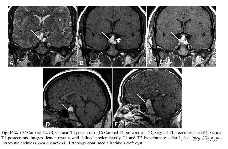 图16.2.(A)冠状位T2, (B)冠状位T1平扫,(C)冠状位T1强化,(D)矢状位T1平扫,和(E)矢状位T1强化图像显示界限明确的T1和T2高信号鞍区病变(箭头),伴两个囊内结节(开放箭头)。病理证实为Rathke裂囊肿。