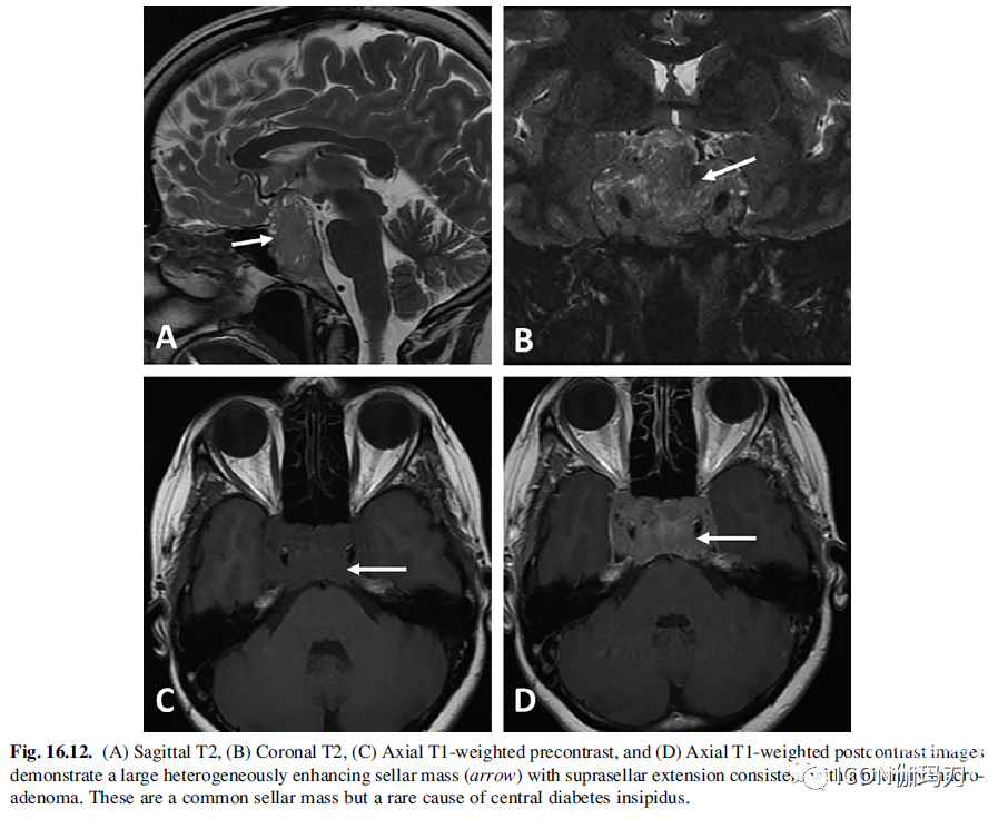 图16.12.(A)矢状位T2, (B)冠状位T2, (C)轴位t1加权增强成像,和(D)轴位T1加权增强成像显示一个巨大的不均匀增强鞍区肿块(箭头),向鞍上延伸,符合垂体大腺瘤。这是一个常见的鞍区肿块,但是一种罕见的导致中枢性尿崩症的原因。