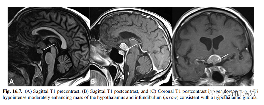 图16.7.(A)矢状位T1平扫,(B)矢状位T1增强,和(C)冠状位T1增强图像显示下丘脑和漏斗部(箭头)的T1低信号中度强化肿块,符合下丘脑胶质瘤。