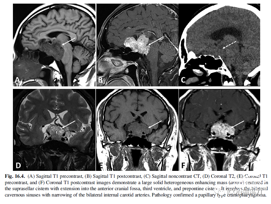 图16.4.(A)矢状位T1平扫,(B)矢状位T1增强,(C)矢状位平扫CT, (D)冠状位T2, (E)冠状位T1平扫,和(F)冠状位T1增强图像显示一个巨大的实质性不均匀增强肿块(箭头)位于鞍上池中央,延伸至前颅窝,第三脑室,和脑桥前池。它累及双侧海绵窦伴双侧颈内动脉狭窄。病理证实为乳头状颅咽管瘤。