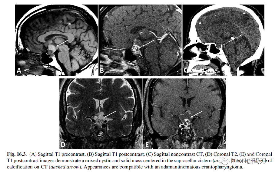 图16.3.(A)矢状位T1平扫,(B)矢状位T1增强扫描,(C)矢状位CT平扫,(D)冠状位T2, (E)冠状位T1增强扫描显示鞍上池中心一囊实性混合肿块(箭头)。CT示钙化(虚线箭头)。外观符合造釉质颅咽管瘤。