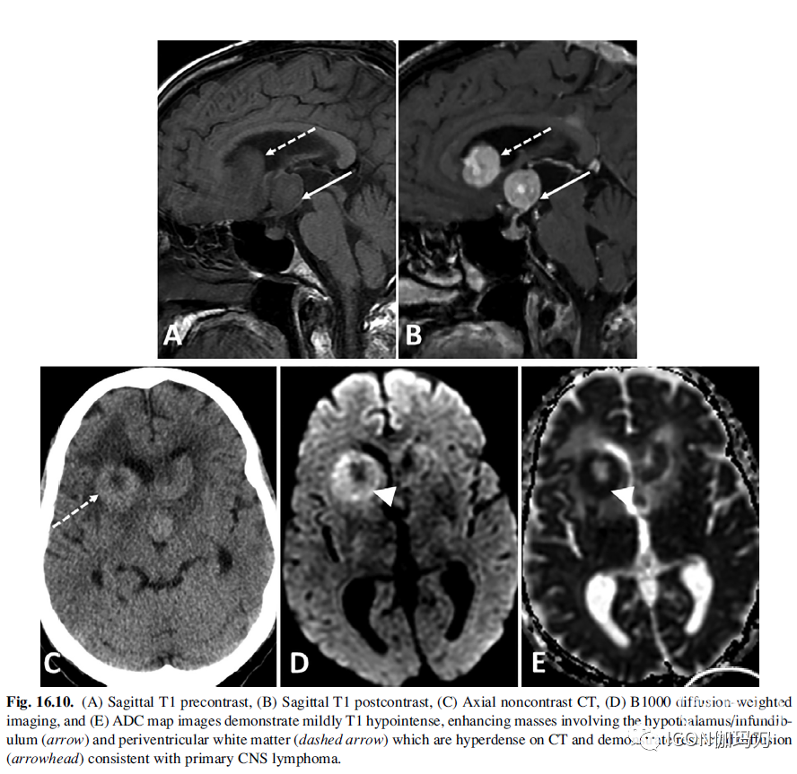 图16.10.(A)矢状位T1平扫,(B)矢状位T1增强,(C)轴位平扫CT, (D) B1000弥散加权成像,(E) ADC图显示轻度T1低信号,强化肿块累及下丘脑/漏斗部(箭头)和脑室周围白质(虚线箭头),CT上呈高密度,弥散受限(箭头),符合中枢神经系统原发性淋巴瘤。