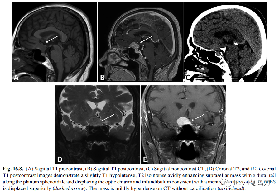 图16.8.(A)矢状位T1平扫,(B)矢状位T1增强,(C)矢状位CT平扫,(D)冠状T2, (E)冠状位T1增强图像显示轻度T1低信号,T2等信号强烈增强鞍上肿块,硬脑膜尾部沿蝶平面,视神经交叉和漏斗移位,符合脑膜瘤(箭头)。PPBS向上移位(虚线箭头)。CT示轻度高密度,无钙化(箭头)。