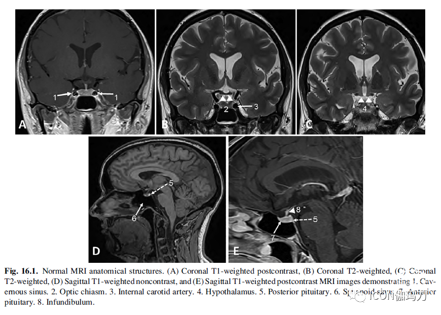 图16.1.MRI解剖结构正常。(A)冠状位T1加权增强,(B)冠状位T2加权,(C)冠状位T2加权,(D)矢状位T1加权平扫,(E)矢状位T1加权增强MRI图像显示:1.海绵窦。2. 视交叉。3.颈内动脉。4. 下丘脑。5.垂体后叶。6. 蝶窦。7. 垂体前叶。8. 漏斗部。