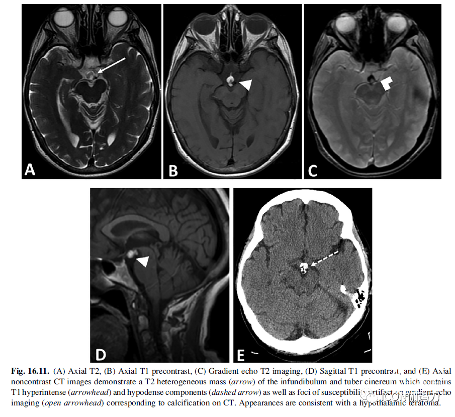 图16.11.(A)轴位T2, (B)轴位T1平扫,(C)梯度回波T2成像,(D)矢状位T1平扫,(E)轴位平扫CT示漏斗部和灰结节T2不均匀肿块(箭头),包含T1高(箭头)和低信号成分(虚线箭头),梯度回波成像可见灶性伪影(开箭头),与CT上的钙化相对应。外观符合下丘脑畸胎瘤。