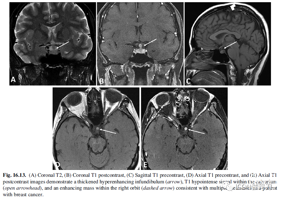 图16.13.(A)冠状位T2, (B)冠状位T1增强,(C)矢状位T1平扫,(D)轴位T1平扫,和(E)轴位T1增强图像显示增厚的高度强化漏斗部(箭头),颅盖骨内T1低信号(开放箭头),右眼眶内强化肿块(虚线箭头),复合乳腺癌患者多发性转移瘤。