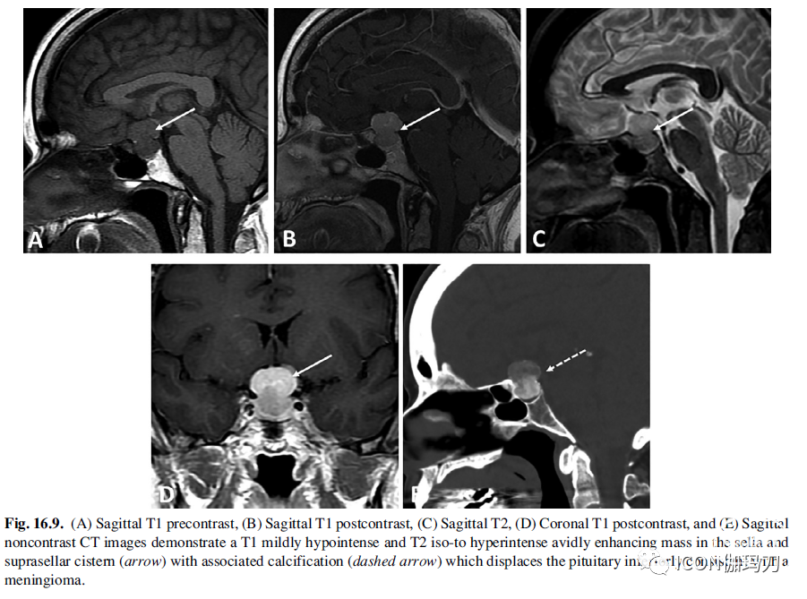 它们通常有一个广泛的硬脑膜附着和明显的均匀强化。可能存在硬脑膜尾征。它们最常见的是T1等信号到轻微低信号,并具有可变的T2信号(图16.8)。磁化伪影可能存在于梯度回波成像,反映钙化。CT有利于显示20% - 25%的钙化和相邻骨的骨质增生,有助于在MRI存在不确定性时提高诊断的确定性(图16.9)。偶尔,与垂体腺瘤的鉴别是有挑战性的。不过,脑膜瘤通常表现出更强烈均匀强化( avid homogenous enhancement),可以看到单独的垂体,通常集中在蝶鞍部,可能有硬脑膜尾征,并可能造成颈内动脉的狭窄,而这在垂体腺瘤则不太常见。