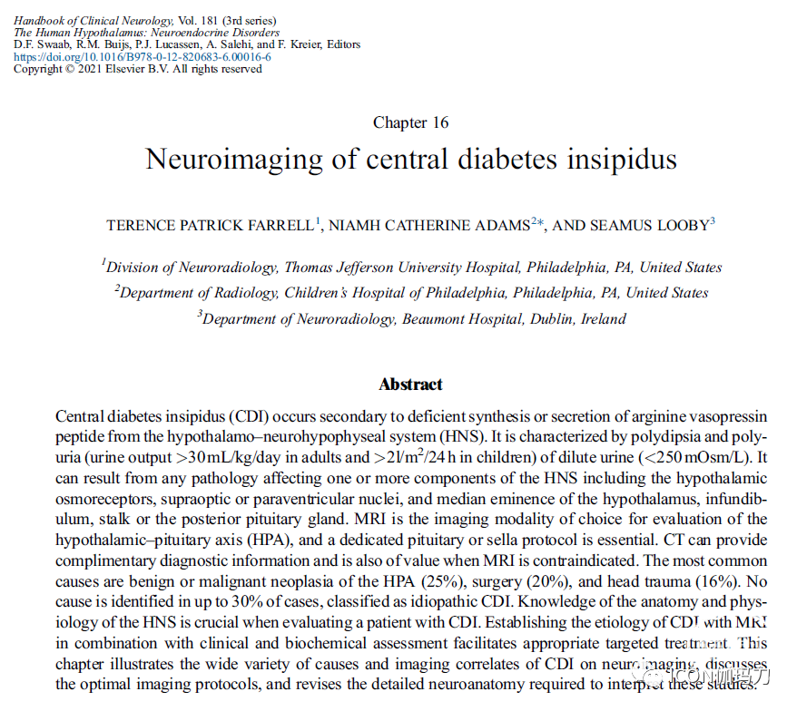 《Handbook of Clinical Neurology》2021年8月刊载[181:207-237.]美国和爱尔兰的 Terence Patrick Farrell, Niamh Catherine Adams, Seamus Looby撰写的综述《中枢性尿崩症的神经影像。Neuroimaging of central diabetes insipidus 》(doi: 10.1016/B978-0-12-820683-6.00016-6.)。