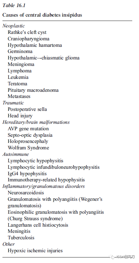 CDI首先是一种生化和临床诊断。生化评估包括血浆钠和渗透压、尿渗透压、24小时尿液收集、血糖和AVP水平。在高钠血症趋势和检测不到AVP水平的基础上,可以考虑进行禁水试验(water deprivation test)来确定尿崩症的诊断。可通过去氨加压素刺激试验(desmospanssin stimulation test)来区分中枢性(加压素缺乏)与肾源性(加压素抵抗)尿崩症。大约25%的患者有HNS的潜在病变,神经影像学可以识别其中大多数患者。通过聚焦垂体腺MRI和HNS确立病因,结合临床和生化评估,有助于靶向治疗。造成CDI的原因有很多,如表16.1所示。最常见的病因是下丘脑垂体轴(HPA)的良性或恶性肿瘤(25%),医源性(iatrogenic)神经外科手术后(20%)和头部外伤(16%),以及一种罕见的病因遗传性/家族性CDI(1%)。12%-50%的患者未从生化检测或神经影像学中确定病因,归类为特发性CDI。