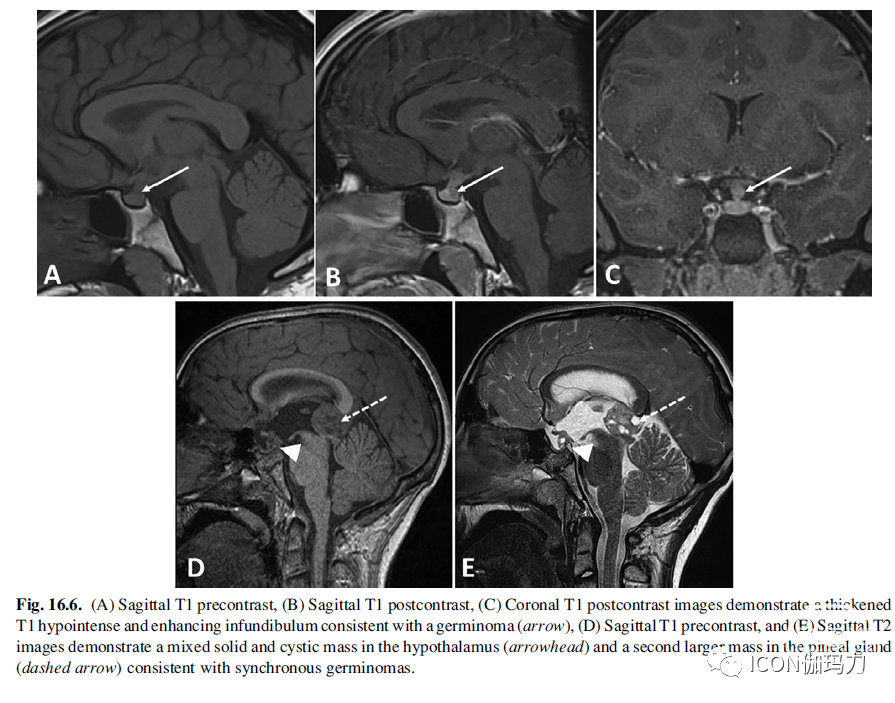 图16.6.(A)矢状位T1平扫,(B)矢状位T1增强,(C)冠状位T1增强图像显示与生殖细胞瘤一致的增厚的T1低信号和漏斗部强化(箭头),(D)矢状位T1平扫,(E)矢状位T2图像显示下丘脑(箭头)有一个混合实性和囊性肿块,松果体(虚线箭头)有第二个更大的肿块,与同时存在的生殖细胞瘤一致。