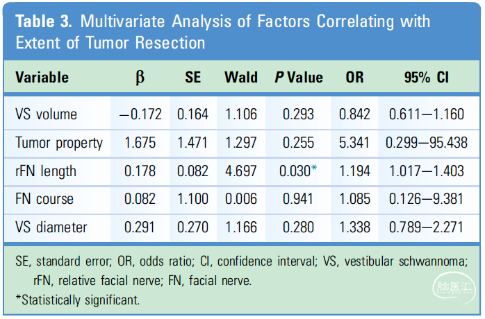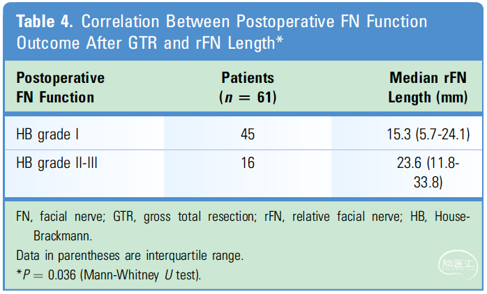 结论:rFN长度是预测手术结果的重要指标之一,rFN长度>36.6mm可能表明难以在保留FN功能的前提下全切肿瘤。因此,rFN长度可以成为神经外科医生预测GTR并保留FN功能手术难度的客观指标之一。