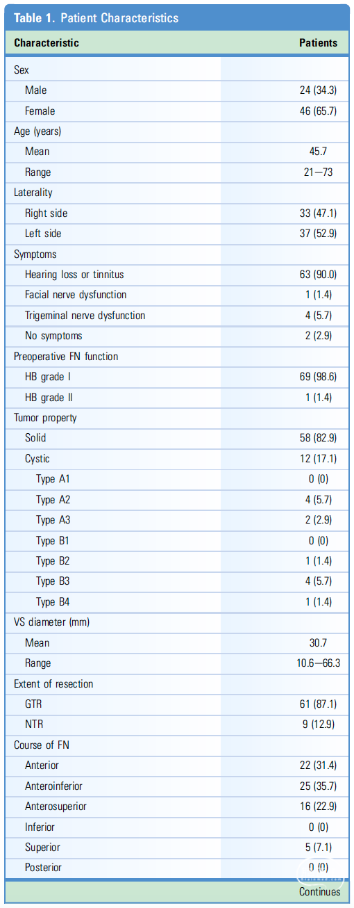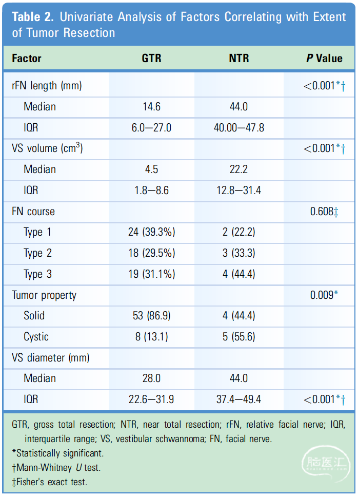 肿瘤切除程度:根据术中显微镜下对肿瘤切除程度进行分级。镜下肿瘤实体全部切除定义为GTR,当只有一小块薄的(约1mm)肿瘤组织残留在FN或脑干上时,定义为近全切除(NTR)。