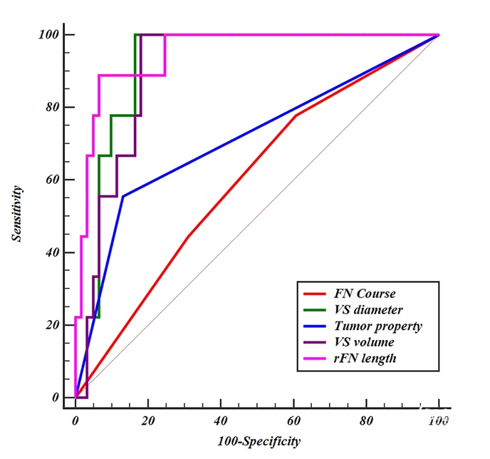 结果:67.1%(47/70)的患者术后FN功能为HB I级,14.3%(10/70)的患者术后FN功能为II级,18.6%(13/70)的患者术后FN功能为III级。61例(87.1%)患者肿瘤完全切除(GTR),另外9例(12.9%)患者有肿瘤残余。rFN平均长度20.8mm(范围为2.5–51.5)。在多变量分析发现rFN长度与肿瘤切除程度有显著相关性。ROC曲线表明,预测近全切除(NTR)与GTR的rFN长度为36.6mm,特异性和敏感性分别为93.4%和88.9%。