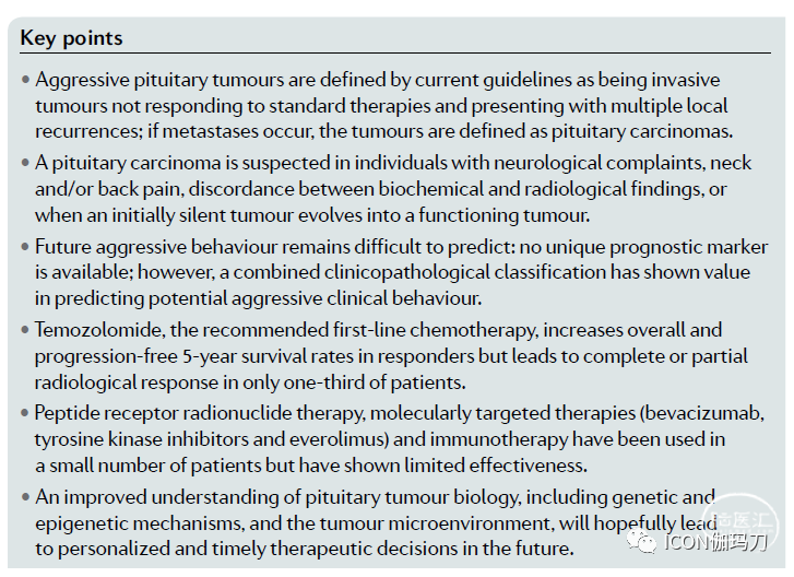就定义而言,垂体癌是由2017年世界卫生组织(WHO)垂体肿瘤分类和2018年欧洲内分泌学会(ESE)进袭性垂体瘤(APTs)和基于存在的转移的垂体癌的指南所定义的。即使在没有明显转移的情况下,一些垂体前叶肿瘤也表现出几乎相同的进袭性行为,并导致致死致残率的增加;然而,它们的定义却不那么明确。WHO 2017年的分类没有将进袭性垂体瘤(APTs)视为一个单独的实体;2004年WHO分类中出现的“不典型腺瘤(atypical adenoma)”的概念(notion)从2017年版中去除。相比之下,ESE指南将APTs定义为对标准治疗(即手术、常规药物治疗和放疗)无反应且存在多次局部复发的肿瘤。此外,有关进袭性的临床病理相关性仍然很差,对未来进袭性行为的预测(这将极大地帮助临床管理)仍存在争议。希望,识别出更多的预后和治疗标志物,以使未来的个体化和及时的治疗决策成为可能。改进垂体前叶肿瘤的分类,提高对其肿瘤内和肿瘤间异质性的了解,以及对其相关肿瘤微环境(TME)的了解,将进一步有助于治疗决策。事实上,如果标准疗法和推荐的一线化疗药物替莫唑胺都失败了,那么目前还没有针对APTs和垂体癌的循证治疗方法。新出现的选择主要是肽受体放射性核素治疗(PRRT)、分子靶向疗法和免疫治疗,这些疗法虽然有前景,但迄今为止效果有限。