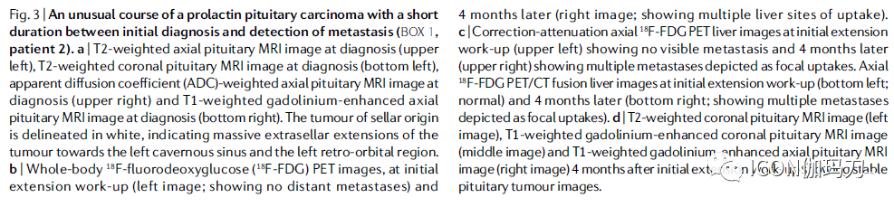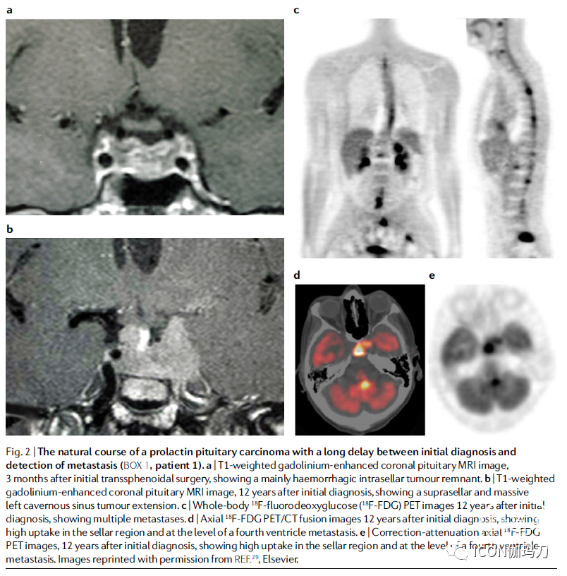 图2.泌乳素垂体癌的自然病程,初始诊断和检测到转移之间有一个长期延迟(框1,病人1)。a|T1 钆剂(gadolinium)-强化冠状位垂体MRI图像,初始经蝶手术后3个月,显示主要出血性鞍内肿瘤残留。b | T1加权钆剂增强冠状位垂体MRI图像,初次诊断12年后,显示鞍上和巨大的左侧海绵窦肿瘤延伸。c |初次诊断12年后全身18F -氟脱氧葡萄糖(18F-FDG) PET图像,显示多灶性转移。d |初步诊断12年后轴位18F-FDG PET/CT融合图像,显示鞍区高摄取和第四脑室水平的转移。e |校正衰减轴位18F-FDG PET图像,在初次诊断12年后,显示鞍区高摄取和第四脑室水平转移。