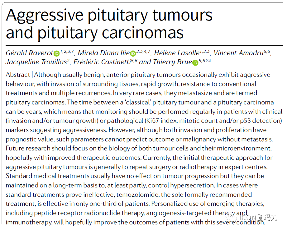 《Nature Reviews. Endocrinology》杂志2021年9月 7日在线发表法国Gérald Raverot, Mirela Diana Ilie, Hélène Lasolle,等撰写的综述《进袭性垂体瘤和垂体癌。Aggressive pituitary tumours and pituitary carcinomas 》(doi: 10.1038/s41574-021-00550-w.)。