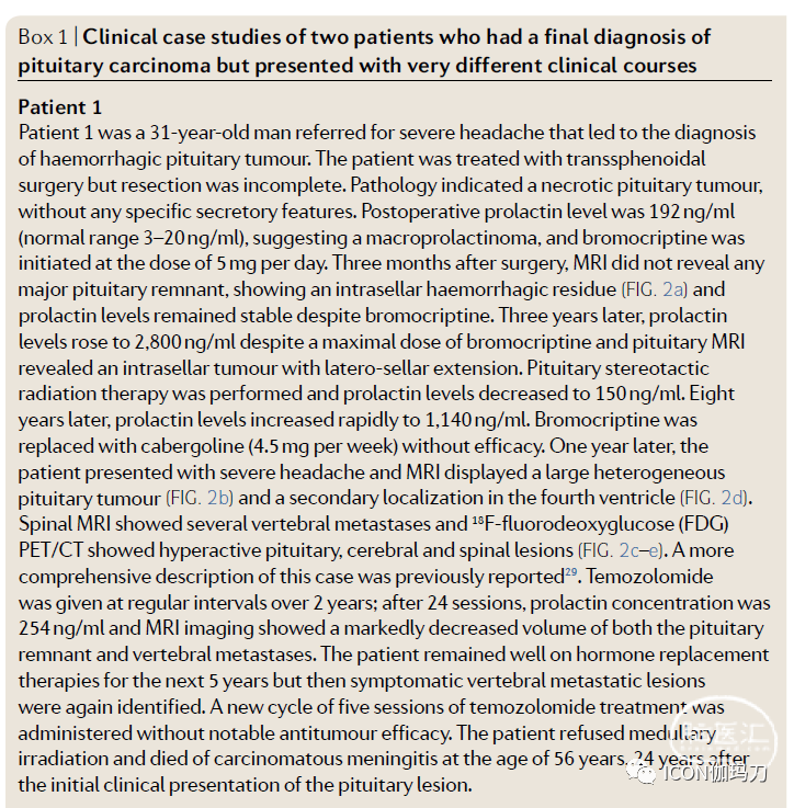 图3.泌乳素垂体癌的异常病程,在最初诊断到发现转移之间短期内(框1,患者2)。