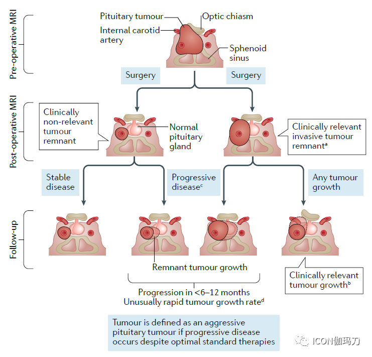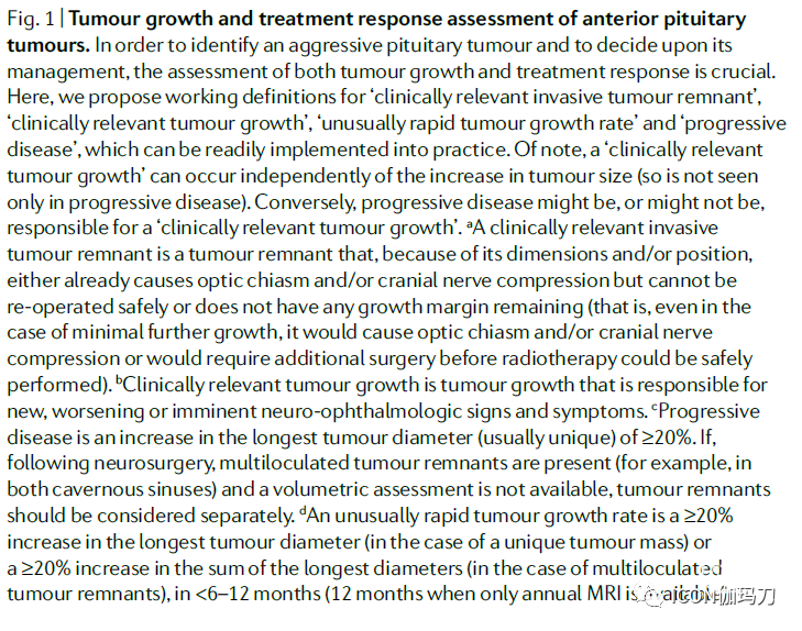 图1.垂体前叶肿瘤生长和治疗反应评估。为了识别经袭性垂体肿瘤并决定其处理,对肿瘤生长和治疗反应的评估是至关重要的。在这里,我们提出了“临床相关性侵袭性肿瘤残余(clinically relevant invasive tumour remnant)”、“临床相关性肿瘤生长(clinically relevant tumour growth)”、“异常快速的肿瘤生长速率(unusually rapid tumour growth rate)”和“进展性疾病(progressive disease)”的工作定义,这些定义可以很容易地应用于实践。值得注意的是,“临床相关性的肿瘤生长”可以独立于肿瘤大小的增加而发生(因此并不只在进展性疾病中可见)。相反,进展性疾病可能是,也可能不是,与临床相关的肿瘤生长有关。