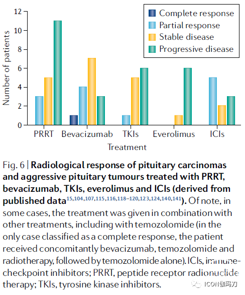 图6.经PRRT、贝伐单抗、TKis、依维莫司和ICIs治疗的垂体癌和进袭性垂体肿瘤的放射影像学反应(来源于已发表的数据)。值得注意的是,在某些情况下,该治疗与其他治疗联合使用,包括替莫唑胺(在唯一被归类为完全缓解的患者中,患者同时接受贝伐单抗、替莫唑胺和放疗,随后仅接受替莫唑胺治疗)。ICI,免疫检查点抑制剂;PRRT,肽受体放射性核素疗法;TKIs,酪氨酸激酶抑制剂。