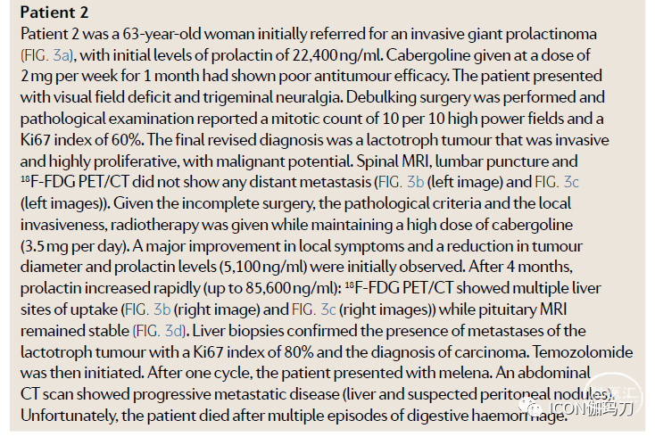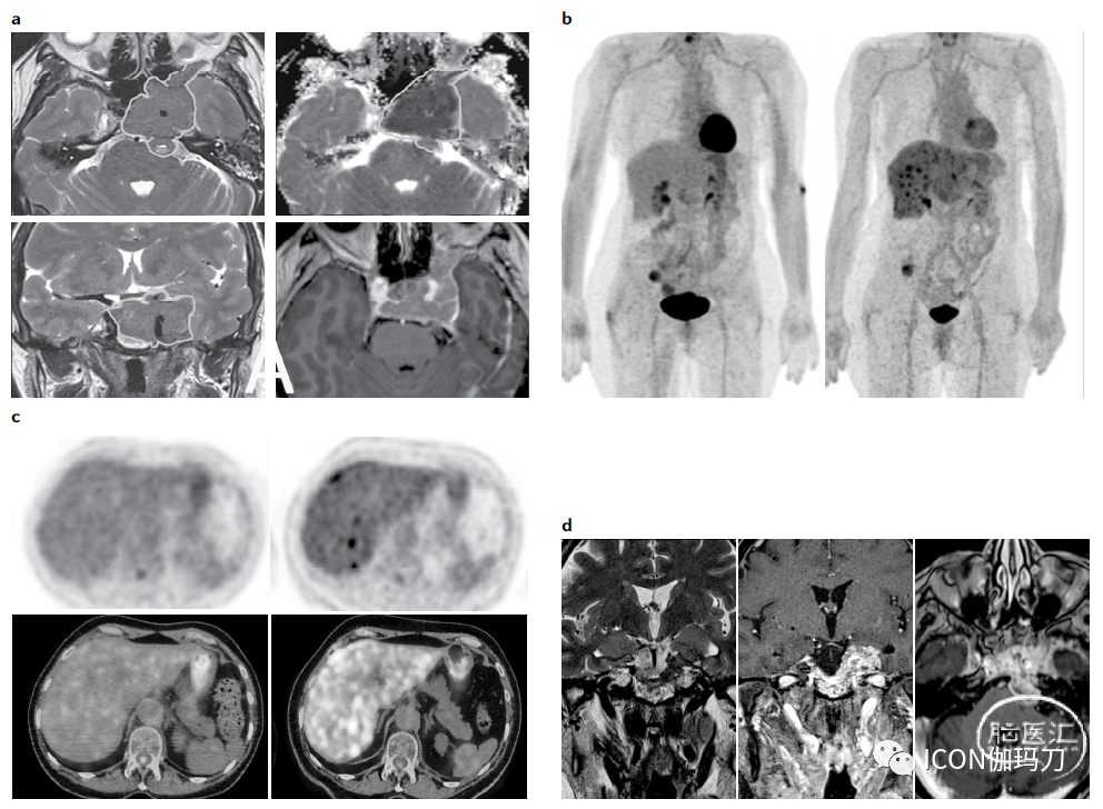 患者2,63岁女性,最初因侵袭性巨大泌乳素瘤而就诊(图3a),初始泌乳素水平为22400 ng/ml。卡麦角林每周2毫克,持续1个月的抗肿瘤疗效较差。病人表现为视野缺损和三叉神经痛。进行了减瘤手术,病理检查报告有丝分裂计数10 / 10个高倍镜视野,Ki67指数为60%。最后修订的诊断是一个泌乳素细胞瘤具有侵袭性和高度增殖性,伴恶性潜能。脊柱MRI、腰椎穿刺、18F-FDG PET/CT均未见远处转移(图3b(左图)、图3c(左图))。考虑到未完全手术、病理标准和局部侵袭性,给予放疗,同时维持高剂量卡麦角林(3.5 mg /天)。初步观察到局部症状有重大改善,肿瘤直径和催乳素水平(5,100 ng/ml)减少。4个月后,泌乳素迅速增加(高达85,600 ng/ml): 18F-FDG PET/CT显示多个肝脏部位摄取(图3b(右图)和图3c(右图)),而垂体MRI保持稳定(图3d)。肝脏活检证实泌乳素细胞瘤的转移,Ki67指数为80%,诊断为垂体癌。然后开始使用替莫唑胺。一个周期后,患者出现黑便(melana)。腹部CT扫描显示进行性转移(肝脏和怀疑腹膜结节)。不幸的是,病人在多次消化道出血后死亡。