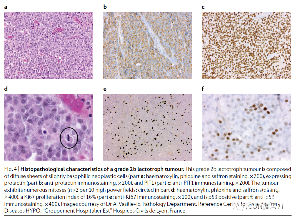 图4.2b级泌乳素细胞瘤的组织病理学特征。2b级泌乳素细胞瘤由弥漫的轻度嗜碱性肿瘤细胞组成(a部分;苏木精,焰红和藏红染色,200倍),表达泌乳素(b部分;抗泌乳素免疫染色,200倍)和PIT1 (c部分;抗-PIT1免疫染色,200倍)。肿瘤表现出大量的有丝分裂(n >2 / 10高倍镜视野;圈起的d部分;苏木精,焰红和藏红染色,400倍),Ki67增殖指数为16% (e部分;抗-Ki67免疫染色,100倍),p53阳性(f部分;抗-p53免疫染色,400倍)。