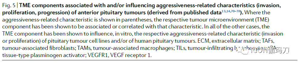 除了免疫细胞,其他垂体TME成分(肿瘤相关成纤维细胞,细胞因子和趋化因子,蛋白水解酶,细胞外基质大分子及其受体,和血管)也被证明是人类垂体瘤的进袭性,和/或影响垂体肿瘤细胞系和/或人类垂体瘤的体外侵袭性和增殖袭(图5)。