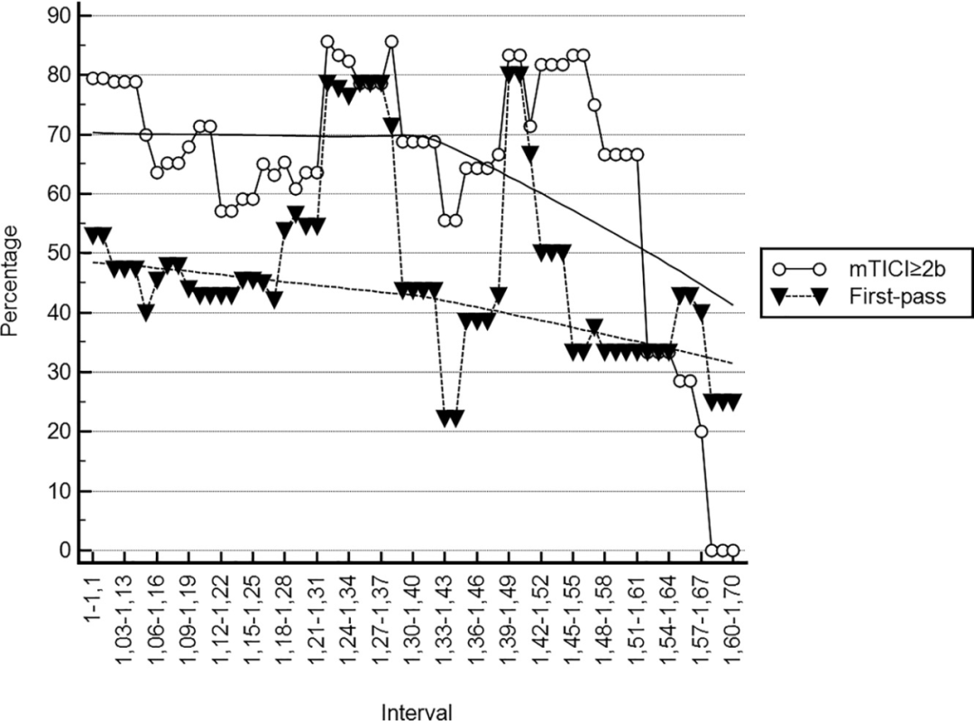 图2. 血管成功再通的趋势(点线)和首过效应(三角形虚线)以及不同血管导管率间隔之间的趋势线。