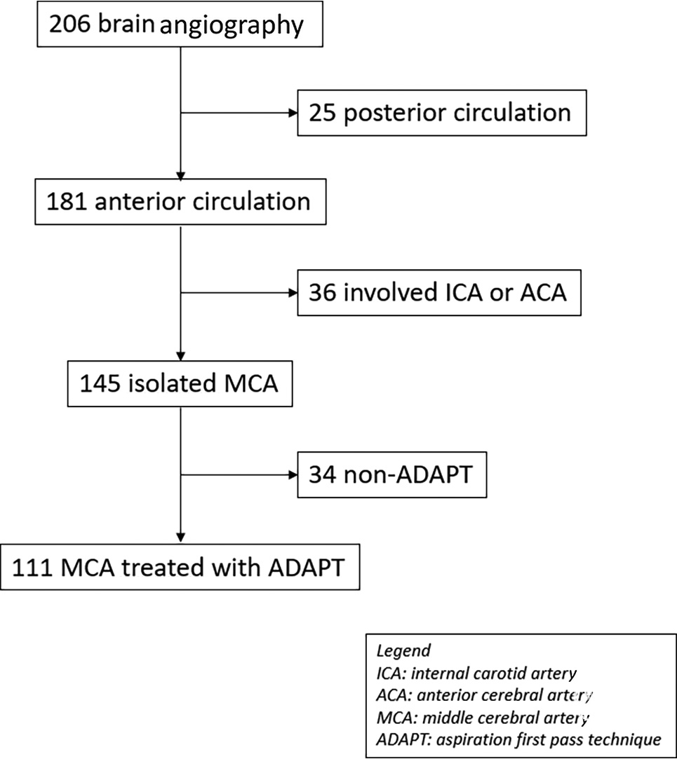 连续纳入的206例患者根据纳排标准筛选后,95/206(46.1%)例被排除。其中包括36例(37.9%)颈内动脉急性闭塞,25例(26.3%)后循环卒中,34例(35.8%)未使用ADAPT技术作为首选治疗方式。最终的研究对象包括111/206例(53.9%)接受ADAPT治疗的大脑中动脉急性闭塞患者,111例(20.7%)中有23例为醒后卒中。纳排流程图如图1所示。