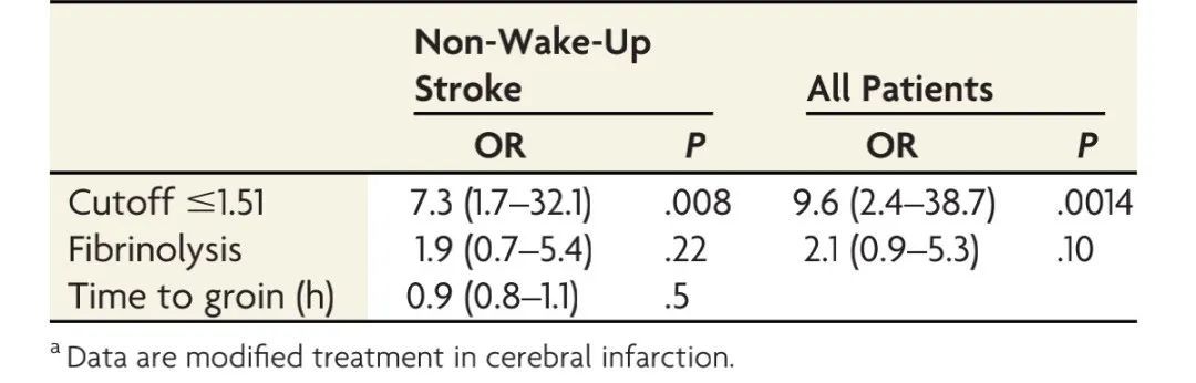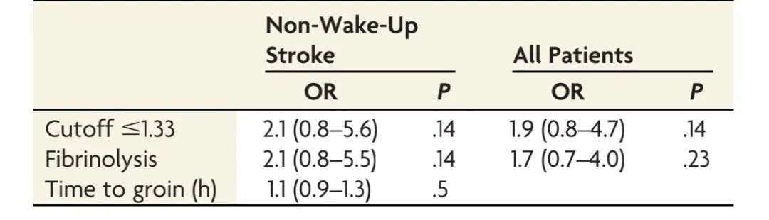 获得mTICI≥2b可能性最大化的最佳血管导管率截止值为≤1.51(准确度为0.67;95%CI 0.58-0.76;P=0.001)。以≤1.51的血管导管率为截止值,获得mTICI≥2b的几率明显高于血管导管率>1.51(OR=9.2;95%CI 2.4-36.2;P=0.002;RR=3.2;95%CI 1.2-8.7;P=0.02)。血管导管比率为≤1.51时观察到获益患者为2.0(95%CI 1.3–4.0)。Logistic回归分析后,所有患者和非醒后卒中患者成功实现成功再通的可能性仍然显著(OR=9.6;95%CI 2.4-38.7;P=0.0014;OR=7.3;95%CI 1.7-32.1;P=0.008)(详见表3和表4)。虽然最高的Youden指数提示血管导管率≤1.33(准确度为0.56;95%CI 0.46-0.65;P=0.31),但是没有确定的cut off数值可以提供。当血管导管率≤1.33时,出现首过效应可能性的趋势,但无统计学意义(OR=2.1;95%CI 0.93-5.0;P=0.07,相对风险度1.5;95%CI 0.93-2.5;P=0.10)。logistic回归分析的OR值也没有统计学意义(见表3和表4)。