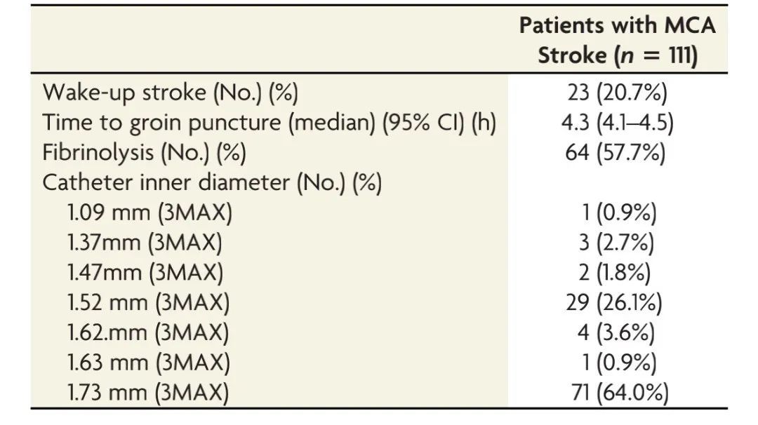所有手术均根据患者临床状况及卒中严重程度,在局麻镇静或全麻下经股动脉入路进行。手术过程采用6F长鞘(NeuroMAX088Penumbra;或AXS Infinity LS,Stryker Neurovascular)置于责任侧ICA,中间抽吸导管尺寸由神经介入医师术中选择。只有1例(1/111,0.9%)选用了扩张导管。使用的中间导管采用Stryker和Penumbra,根据内径分为以下几种:1.37mm(5MAX ACE)、1.47mm(AXS Catalyst 5;Stryker)、1.52mm(AXS Catalyst 6)、1.62mm(AXS Catalyst 7)、1.63mm(ACE64)和1.73mm(ACE68)(详见表2)。使用的远端抽吸导管的远端内径为1.09(3MAX;Penumbra)。ADAPT技术始终在管腔内没有微导丝的情况下进行,过程中使用抽吸泵(Pump MAX;Penumbra)。