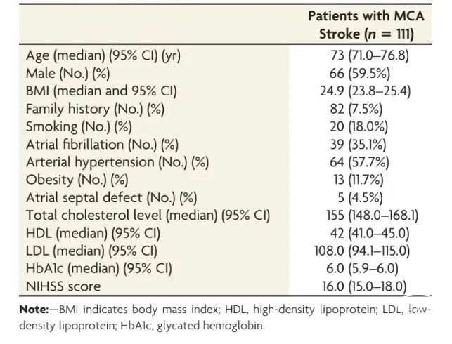 本研究是一篇单臂、单中心回顾性队列研究。主要收集作者研究单位中心2018年1月至2020年4月行血管内治疗所有患者。排除标准为非大脑中动脉急性闭塞及未应用ADAPT技术的血管内治疗。患者基线数据见表1。