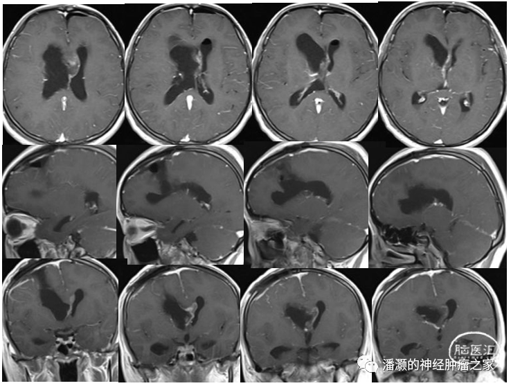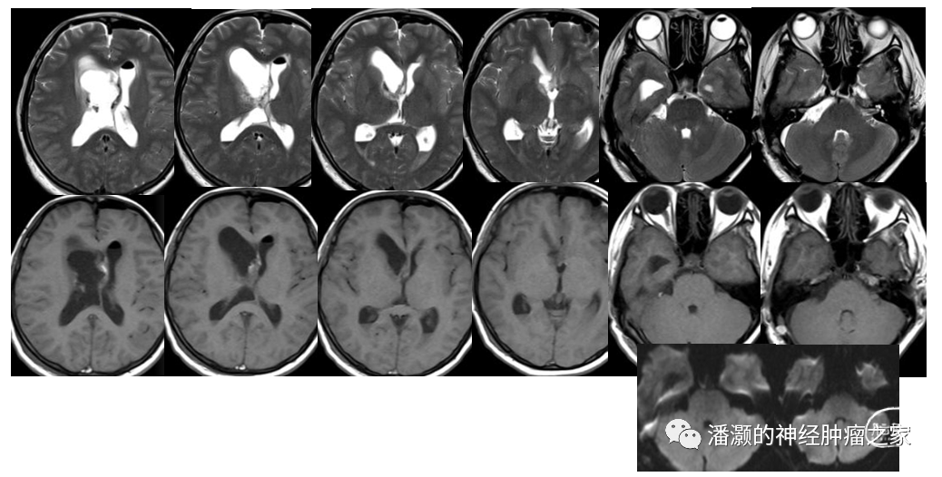 患者女性,30岁,主诉为头痛头晕2月。入院查体:行走不稳,肌力肌张力正常,余神经系统无特殊。入院辅助检查:右侧脑室占位、右侧桥小脑角区占位。