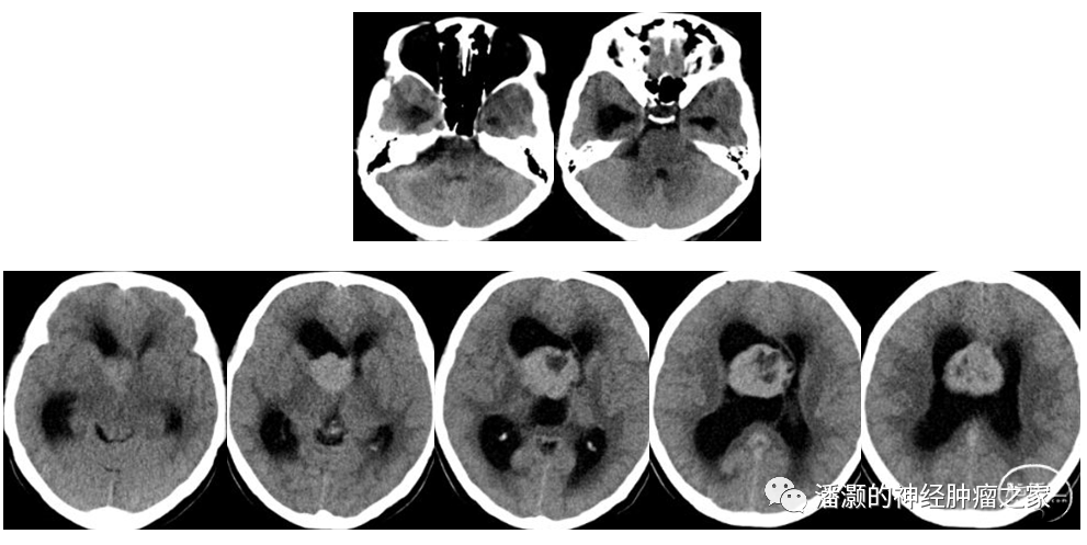 CT提示右侧CP角低密度占位,右侧脑室额角为主等低密度混杂占位,幕上脑室系统扩大。